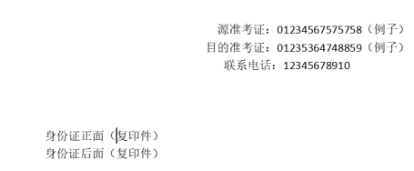 合并准考证:把身份证正反面复印到一张A4纸上,在A4纸右上角把源准考号,目的准考证号和联系电话都写出来,例子如下: