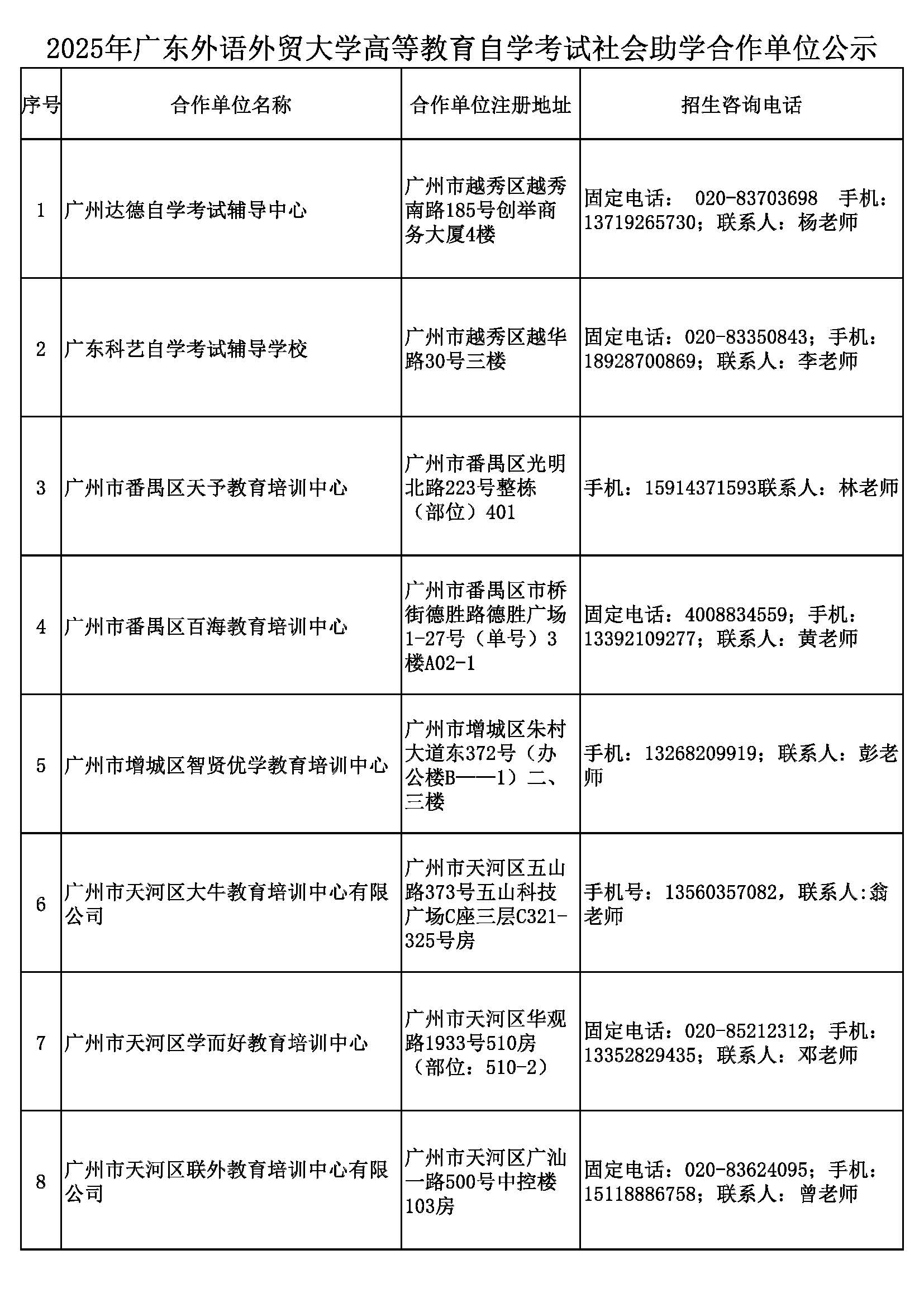 1.广东外语外贸大学2025年高等教育自学考试社会助学合作单位一览表