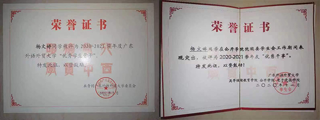 大学“优秀学生骨干”;学院团委学生会“优秀干事”;大学预科部“三好学生”;大学预科部奖学金一等奖;学院第十一届艺术•设计学生作品大赛综合绘画第二名;学院第七届绘画大赛优秀奖;学院第二届摄影大赛优秀奖;学院“学党史、绘党情、跟党走”主题艺术创作比赛综合绘画优秀奖;预科部第八届学生优秀作品展POP设计类二等奖、素描类三等奖、插画类三等奖、插画类优秀奖;预科部“遇见美好”摄影比赛优秀奖。