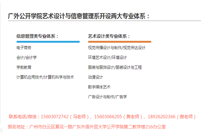 学院现有全日制在校学生5000多人,开设专业有:视觉传播设计与制作/视觉传达设计(原艺术设计平面广告设计)、环境艺术设计/环境设计(原艺术设计室内外装潢设计)、服装与服饰设计/服装设计与工程、动漫设计/数字媒体艺术、广告设计与制作/广告学、电子商务、会计/会计学、计算机应用技术/计算机科学与技术(原移动商务技术)、学前教育等专科和本科专业全日制学习。 学生通过规定科目的考试可获取由广东省自考委颁发的广东外语外贸大学副署的本(专)科 毕业证书,以及相关行业资格证书,符合规定条件的本科毕业生可授予学士学位。