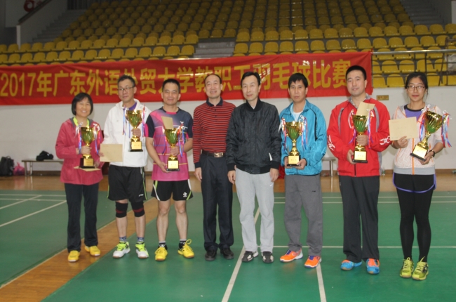 本网讯 12月9日,2017年广东外语外贸大学教职工羽毛球赛在北校区羽毛球馆圆满落幕。本次比赛共有21个二级工会组队报名参赛,有131名运动员参加比赛。我院选派了13名教职工组队参加比赛,他们配合默契,顽强拼搏,取得了团体总分第二名的好成绩。
