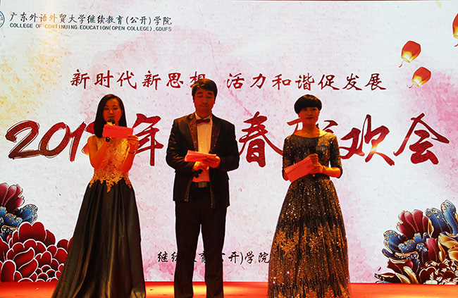 本网讯 1月20日下午,我院在夏茅校区演艺中心举行了以“新时代新思想,活力和谐促发展”为主题的教职工联欢会。学院领导、全体教职员工及部分离退休员工欢聚一堂,喜迎新春,共同表达对2018年的美好祝福与期待。会后,全体人员移步饭堂三楼,开展“迎新春,包饺子”活动。