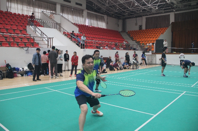 本网讯 12月2日,2023年广东外语外贸大学教职工羽毛球比赛在白云山校区羽毛球馆举行,26个工会共96名运动员报名参赛。我院选派12名教工代表,由工会主席、副院长任跃忠带队参赛,获得团体总分第一名的优异成绩。