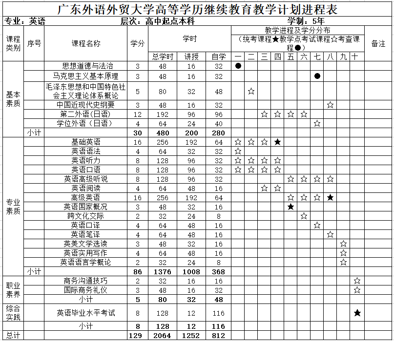 总学分129,其中基本素质课程30学分;专业素质课程86学分;职业素质课程5学分;综合实践课程8学分。