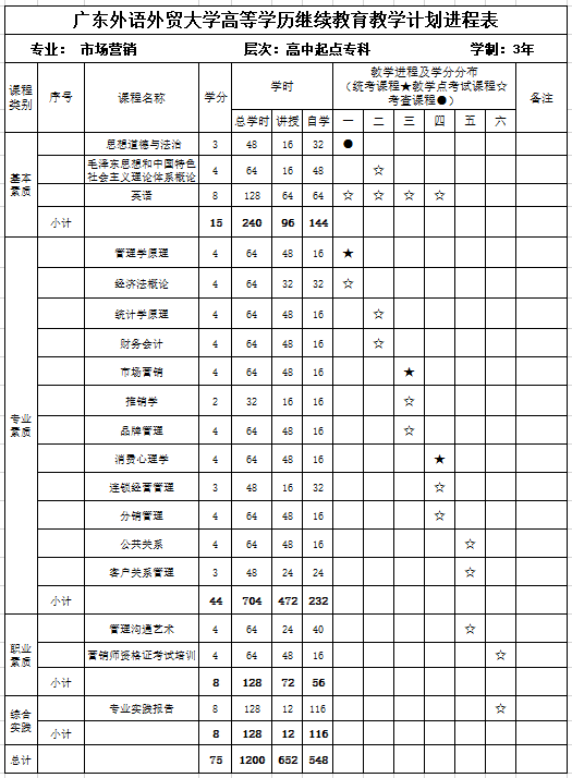 总学分75,其中基本素质课程15学分;专业素质课程44学分;职业素质课程8学分;综合实践课程8学分。