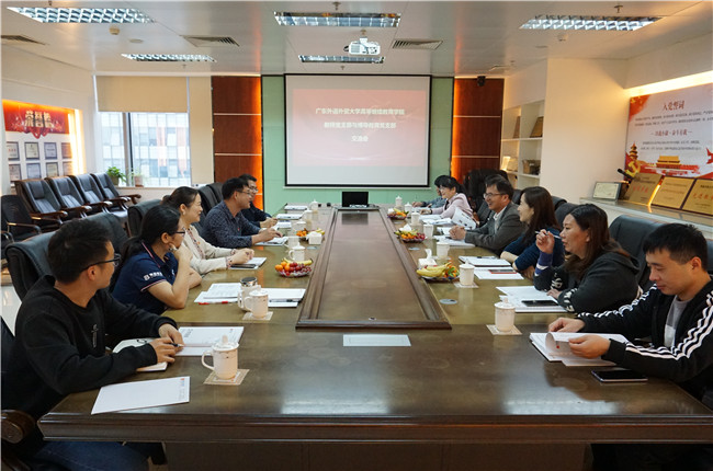 廉政学习结束后,与会人员前往博导教育机构学习交流。交流会上,银俊强对我院教师党支部的前往表示热烈的欢迎,他介绍,博导教育的党建服务中心成立较早,党建工作有特色,在开展教学工作的同时始终贯彻牢牢把握政治方向,确保政治路线正确的重要原则,按照广外高教院的要求,将开展课程思政的工作落到实处。