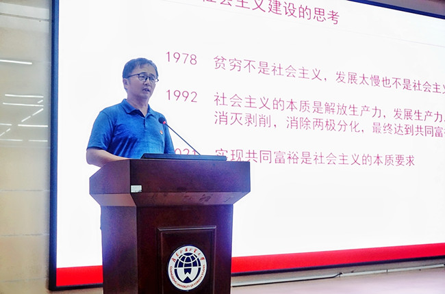 讲座中,邵兵从“什么是共同富裕”、“共同富裕是党的执政基础”、“理解共同富裕的深刻内涵”、“如何实现共同富裕”四个方面徐徐展开。邵书记说,中国特色社会主义进入新时代,以习近平同志为核心的党中央不忘初心、牢记使命,以高度的历史责任感和使命感重视推进全体人民共同富裕在中国的实践和探索,形成了一系列重要论述,为科学理解和推进新时代共同富裕伟大事业提供了根本遵循和行动指南。接着,他从共同富裕的覆盖面、含义、实现途径、阶段性四个方面做了详细的解读。